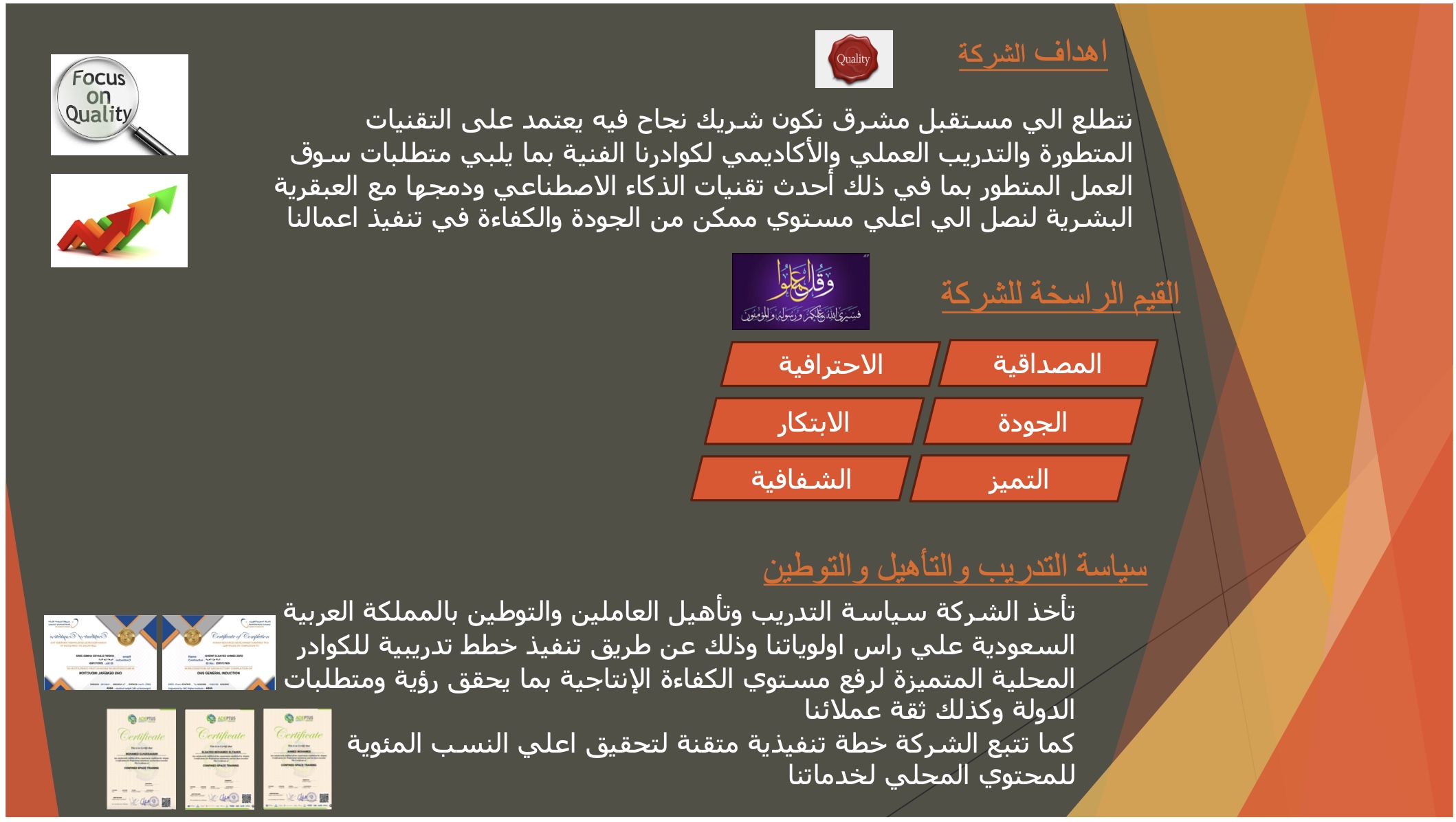 نتبع احدث التقنيات الحديثة التي تعمل على تلبية الامن والسلامة والوقاية بمشاريع الشركة